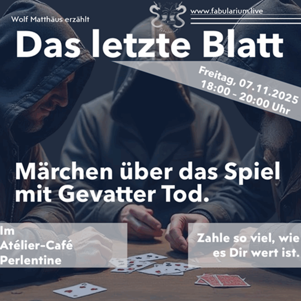 Am 07.11.2025 bietet der Märchenerzähler Wolf Matthäus Märchen und Geschichten über Menschen dar, die sich dem Sensenmann nicht einfach hingeben. Es geht um Tricksereien und Glücksspiel. Und mit viel Augenzwinkern stellt sich am Ende die Frage: ist der Tod nicht auch nur ein Mensch?